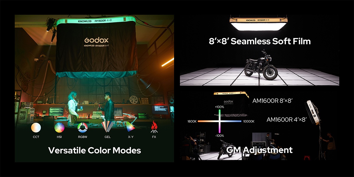 AM1600R, 1600W çıkışıyla geniş alanda güçlü ve tam renkli yumuşak ışık sunar. CCT / HSI / RGBW / GEL / FX modlarının tamamını destekler ve G/M ayarı sayesinde her çekim ortamına hassas tint uyumu sağlar. 8×8 kesintisiz difüzyon film ile eşleştirildiğinde son derece pürüzsüz ve yumuşak bir ışık elde edilir.
