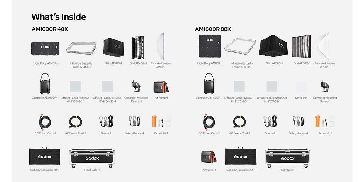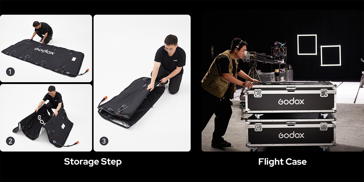Geniş ölçekli aydınlatma kurulumlarının depolama ve taşıma sorunlarını çözmek için tüm sistem—ışık panelleri, şişirilebilir çerçeve ve aksesuarlar dahil—tamamen katlanabilir olarak tasarlanmıştır. Özel flight case, tüm seti kompakt şekilde taşımaya hazır hale getirir.