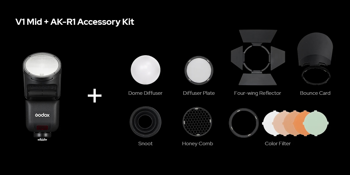 V1 mid, AK-R1 Yuvarlak Başlı Aksesuar Kiti ile tam uyumludur ve portre, etkinlik ve yaratıcı çekimler için hızlı ışık şekillendirme imkânı sunar. Ayrıca S3 Speedlite Bracket ile birlikte Bowens mount aksesuarları da destekleyerek kompakt bir kurulumla çok daha geniş bir ışık şekillendirme dünyasının kapılarını açar.