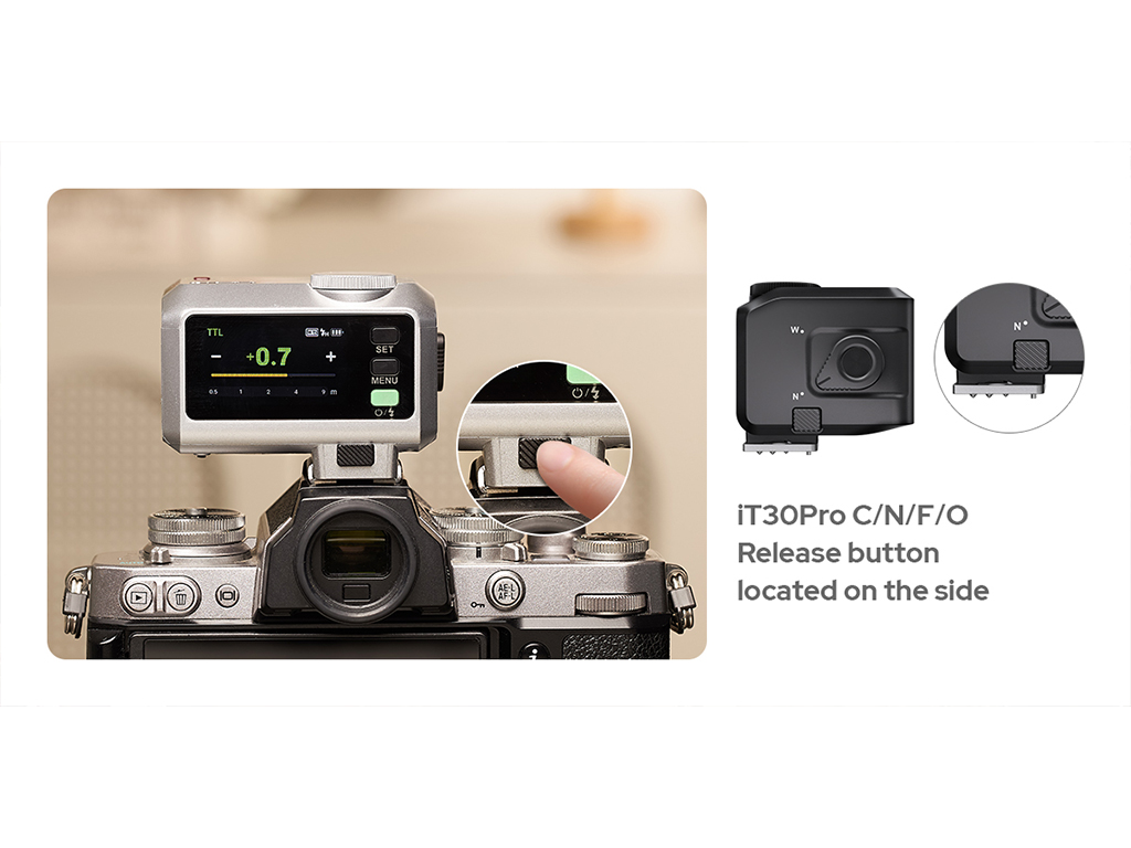 Geleneksel bir speedlight’ın yalnızca dörtte biri boyutunda ve sadece 120 g ağırlığında olan iT30 Pro, her çantaya kolayca sığar—saha çekimleri için idealdir.
