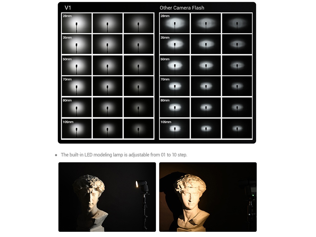 • V1, Canon, Nikon, Sony, Fujifilm, Olympus & Panasonic ve Pentax serisi kameralarla uyumlu TTL desteği, 1/8000 sn yüksek hızlı senkron (HSS), FEC, ikinci perde senkronu ve manuel flaş gibi gelişmiş özellikleri destekleyerek, uyumlu kamera/model ile eksiksiz bir flaş deneyimi sunar.
