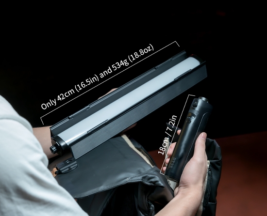 için tüp ışığı, pil tutucusunu ve aydınlatma kontrol aksesuarlarını sorunsuz bir şekilde bağlayabilir ve verimliliği önemli ölçüde artırabilirsiniz. Sıkıştırıldığında, tüp ışık yalnızca 42 cm / 16,5 inç uzunluğundadır ve sapı yalnızca 900 g / 31,7 oz ağırlığındadır, bu da onu benzer ürünlerden %75 daha hafif yapar. Hafif tasarım, herhangi bir kamera sırt çantasında veya alet kutusunda zahmetsizce saklama olanağı sağlayarak hızlı ve rahat bir taşıma sağlar. Cihaz, tek bir şarjla 2 saate kadar sürekli tam güç kullanımı sağlayan dahili 45 Wh pil sapı dahil olmak üzere çeşitli güç kaynağı çözümleri sunar. Ayrıca, hem ışık çubuğu hem de sap, güç alırken kesintisiz çekim sağlayan PD hızlı şarj için USB-C bağlantı noktalarıyla donatılmıştır. Çok yönlü montaj seçenekleri, kolay kurulum ve esnek aydınlatma yapılandırmaları için 1/4" ve 3/8" standart ARRI konumlandırma pimleri, NATO rayları ve diğer arayüzler aracılığıyla bağlanan kulp veya diğer kurulumları kullanarak elden aydınlatmaya olanak tanır. Ayırt edici üçgen kesitli kordon tasarımı, ergonomiyi iyileştirerek uzun süreli elden kullanım sırasında yorgunluğu en aza indirir ve düz bir yüzeye yerleştirildiğinde kazara düşmeleri önler. 0,5 m/5600 K kurulumu ve bir PC difüzörüyle bile ışık, 96+ CRI Ra ve 98+ TLCI ile renk doğruluğunda mükemmellik sağlayarak 2.350 lüks aydınlatmayı korur. Renk sapması (?UV), 2700 K ve 5600 K'de -0,0005 ile +0,0005 arasında değişir ve profesyonel renk performansı ve doğal gün ışığının doğru şekilde yeniden üretilmesini sağlar. Tüp ışık, eloksallı alüminyum alaşımlı gövdeye ve geniş kavisli PC difüzöre sahiptir ve sapı, dayanıklılık, etkili ısı dağılımı ve sessiz çalışma sağlamak için silikon kaplama ile kaplanmış sağlam bir PC ve ABS karışımından üretilmiştir. Titiz işçilikle, toz ve suya dayanıklılık için IP54 derecesine sahiptir ve bu da onu zorlu dış mekan çekim koşulları ve gece çekimleri sırasında öngörülemeyen durumlar için uygun hale getirir. Geniş ışın açılı yumuşak, düzgün ışık, portre fotoğrafçılığında kusursuz ve zarif anları yakalamak için mükemmeldir. Çok yönlü ayar düğmeleri,özel kontrol düğmeleri ve 0,96 inç OLED ekrana sahip olan bu ürün, iki renkli ışık, RGB, özel efektler, renk modları, 2500K-10000K gün ışığını, 36000 RGB rengi, 18 yaygın özel efekti ve 8 yaygın renk filtresini simüle etmek için ön ayar modları dahil olmak üzere ışık ayarlarını hassas ve hızlı bir şekilde ince ayarlayabilirsiniz. Ek olarak, 5 öncedenayarlanmış parametre arasında hızlı geçişi destekler. Ürün, kapakçıklar (pil tutma yeri versiyonuyla standart) ve isteğe bağlı softboks ve petek ızgara bağlantıları gibi temel ışık değiştiricilerle donatılmıştır. Ayrıca, standart 3/8" ARRI ışık standı adaptörleri ve konektörleri (yakında ek aksesuarlar mevcut olacak) ve dahili pile sahip sap gibi güç artırma aksesuarları gibi çok yönlü montaj aksesuarlarına sahiptir. Daha fazla rahatlık için, üstün çıktı kalitesi, verimlilik, taşınabilirlik, dayanıklılık, kolay kurulum, hassas ışık kontrolü ve güvenilir performans arayan kullanıcılar için kapsamlı bir çözüm sunan taşınabilir bir saklama çantası içerir.