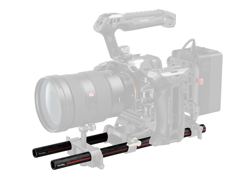 SmallRig 15 mm Karbon Fiber Çubuklar (Çift, 8") 5211 ve (Çift, 12") 5212, birlikte verilen 15 mm çubuk kelepçeleriyle aksesuarın genişletilmesini kolaylaştırmak için