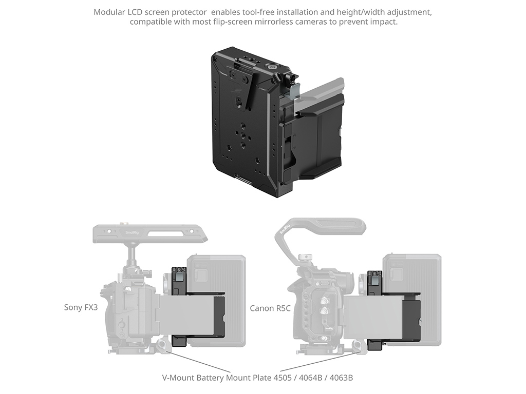 1.LCD ekran koruyucuyu kullanırken, pil plakası 80mm / 3,1″ genişliğe kadar V montajlı pilleri barındırabilir. Uyumlu SmallRig V-mount piller: 3579B / 4871 / 4872 /