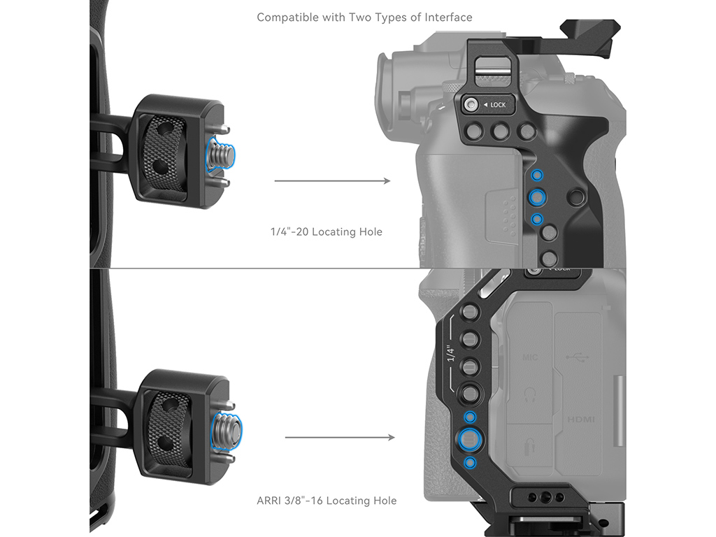 üzere tasarlanmıştır. Geri çekilebilir arayüzleri, hem 1/4"-20 hem de 3/8"-16 ARRI yerleştirme deliklerini barındırarak çeşitli kafesler ve montaj plakalarıyla geniş