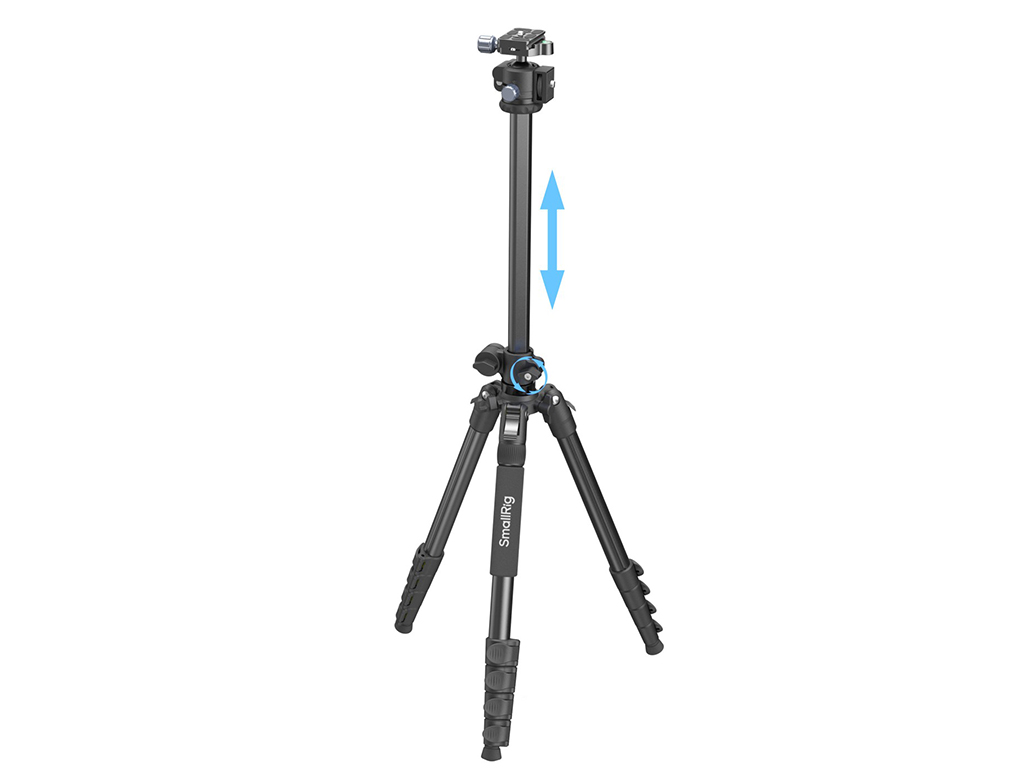 açılı çekimler için 180°'ye kadar eğilebilen benzersiz bir merkez sütuna sahiptir. Tripod, bacakların hızlı ve güvenli bir şekilde sıkılması için bir çevirmeli kilit