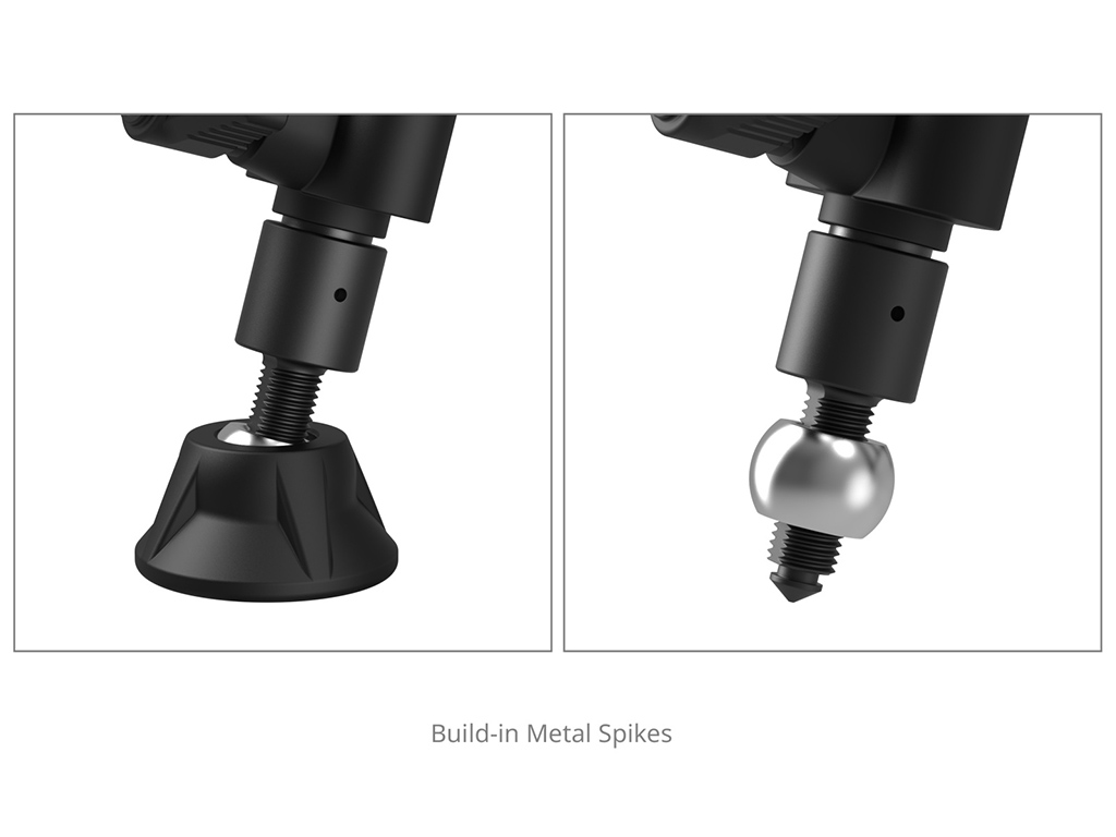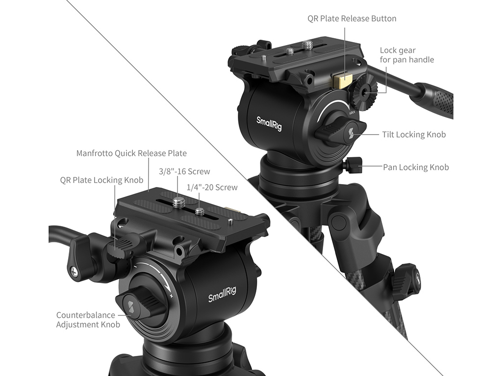 The tripod is equipped with a precision-engineered aluminum alloy fluid head that supports a payload capacity of 10kg ((22.05lb). This head features a tilt damping adjustment knob, allowing for precise control for gears of different weight, ensuring smooth camera movements for cinematic-quality shoots. It is also compatible with standard Manfrotto quick release plates that support lateral mounting, enabling quick and secure camera attachment.