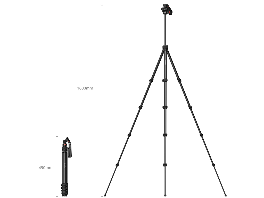 With an adjustable center column that extends to a working height of 160cm (63.0in), this tripod meets diverse shooting requirements. When it’s time to pack up, it collapses to a compact 49cm (19.3in) for easy transport, weighing just 718g (25.33oz) — making it the perfect companion for on-the-go shooting.