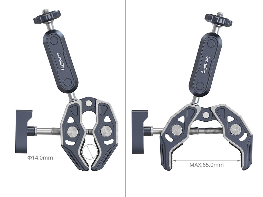 Kelepçe, Φ14mm ile Φ60mm arasında değişen çubukları ve 65mm kalınlığa kadar yüzeyleri destekleyerek kameraların, monitörlerin, LED video ışıklarının ve daha