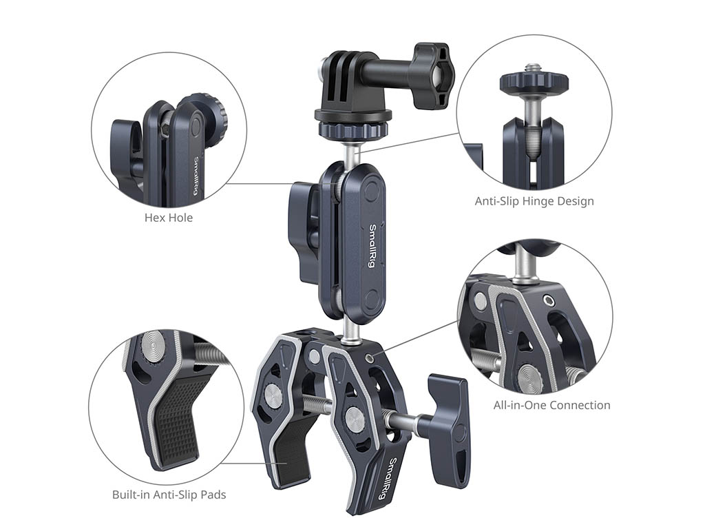SmallRig Yengeç Şeklinde Süper Kelepçe Kiti (Bilyalı Başlık Sihirli Kolu ile) 5529, sağlamlığı ve dayanıklılığı artırmak için CNC işleme ve hassas oyma özelliklerine sahip,