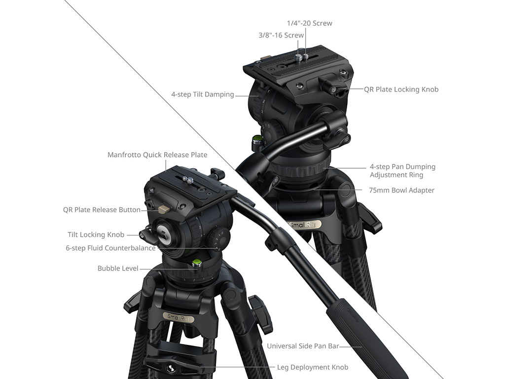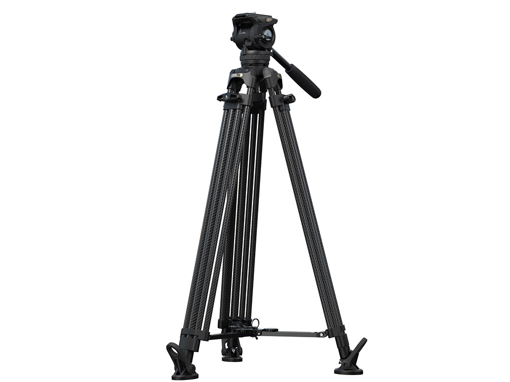 fiber bacaklar (Ø16mm) ve standart 75mm kase tabanı ile üretilen tripod, 6 kademeli dengeleyici ve bağımsız 4 seviyeli eğim/pan sönümleme kontrolüne sahip akışkan bir kafa