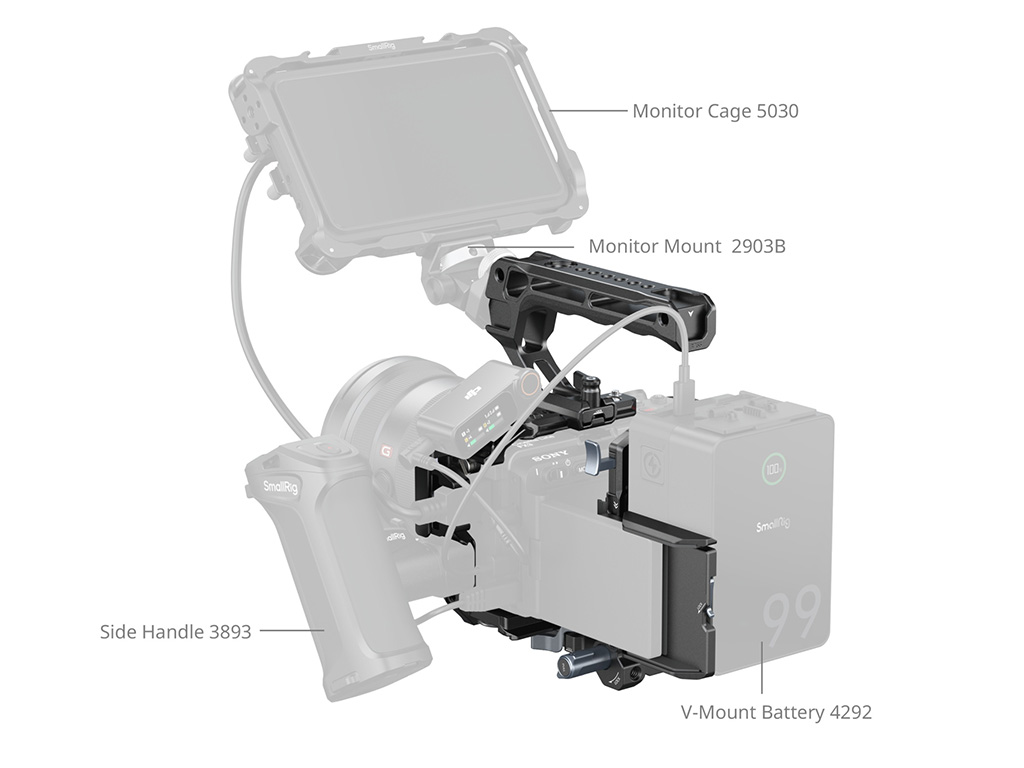 Üstteki modüler NATO rayı, SmallRig'in NATO üst tutacağı (ID 3766) ve monitör montajı (ID 2906B) ile uyumludur, ancak Sony'nin orijinal XLR üst tutacağı ile kullanım