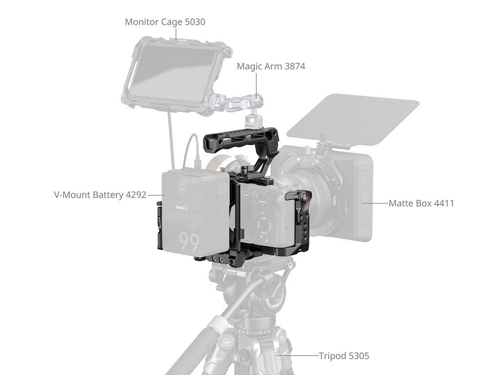 SmallRig Sony FX3 / FX30 5823 için Kafes Kiti, sade, stabil ve hafif bir kurulumu korurken profesyonel V-mount pil gücü sağlayan kompakt bir el tipi güç çözümüdür.