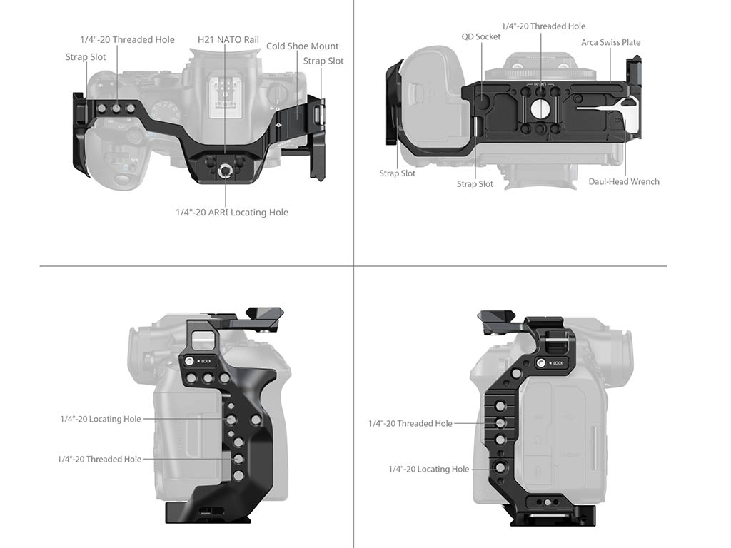 • Çok Yönlü Genişletme Yeteneği: Tüm seri, 1/4"-20 dişli delikler, ARRI 3/8"-16 konumlandırma delikleri, soğuk yuva bağlantıları, QD soketleri ve kayış yuvaları dahil