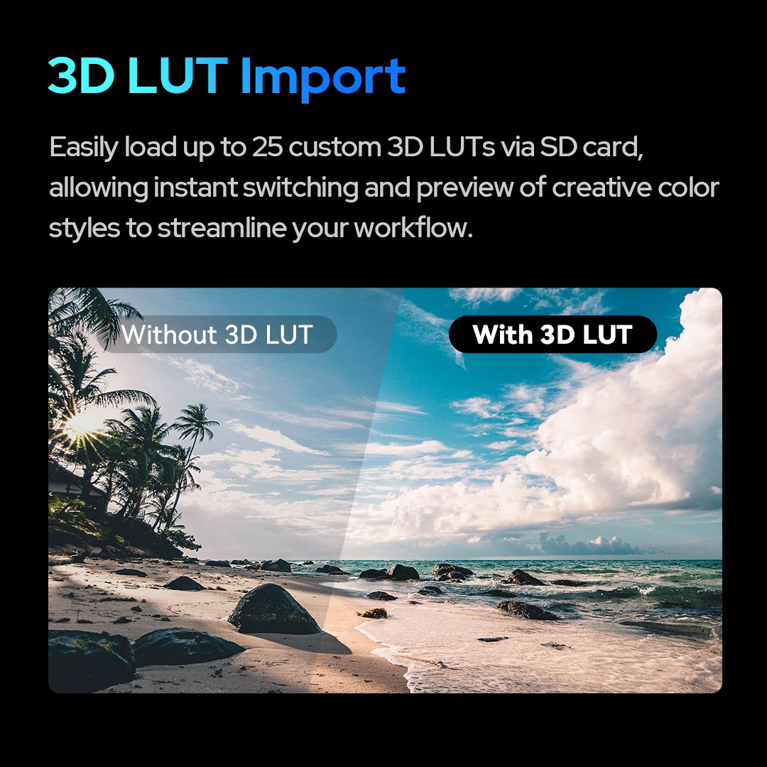 SD kart aracılığıyla 25 adede kadar özel 3D LUT'u kolayca yükleyerek yaratıcı renk stilleri arasında anında geçiş yapabilir ve iş akışınızı hızlandırmak için önizleme yapabilirsiniz.