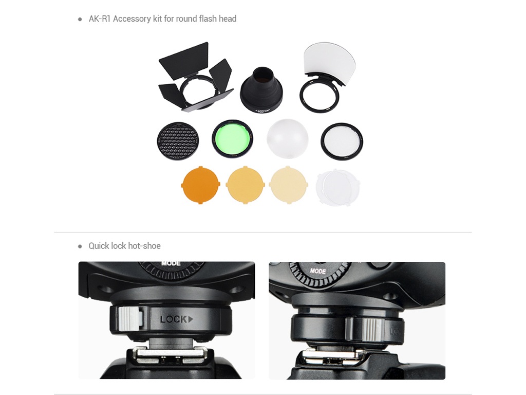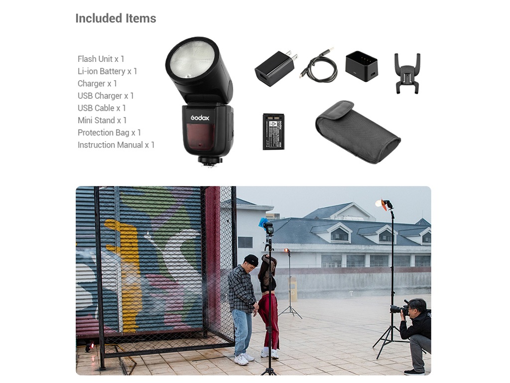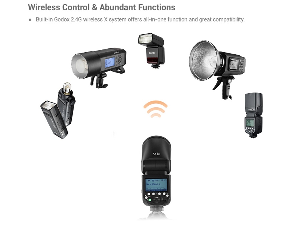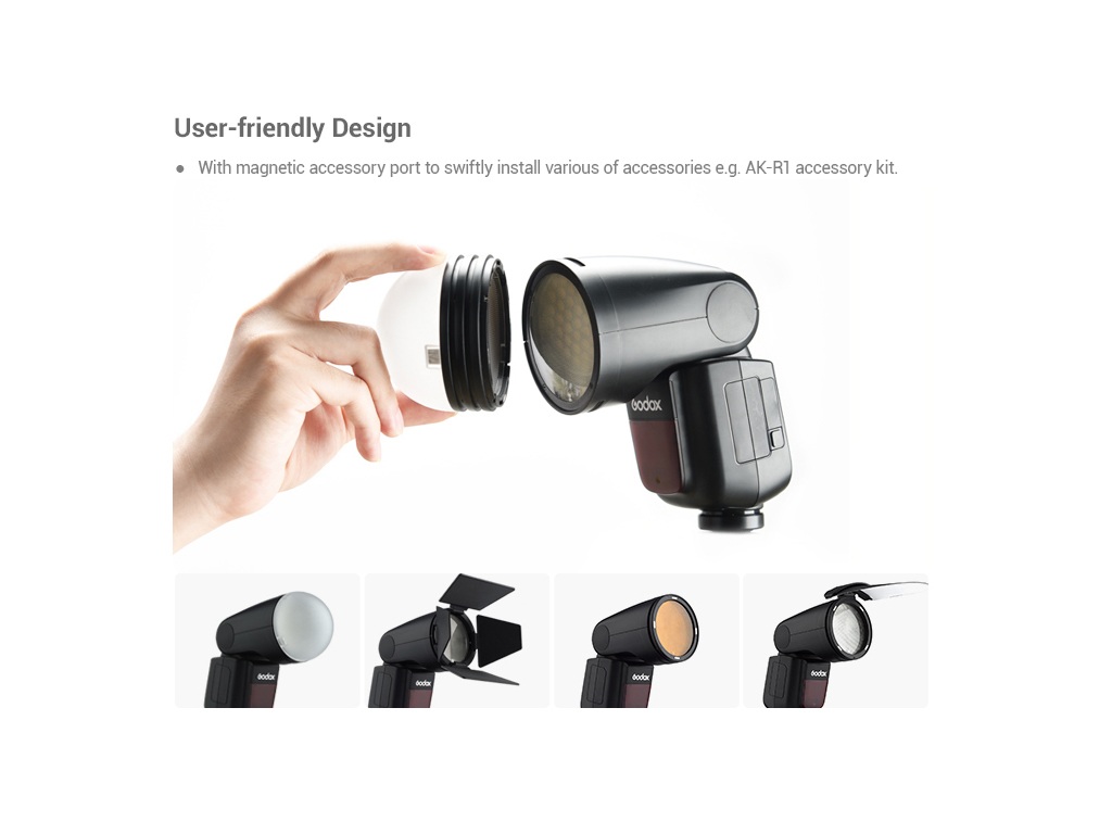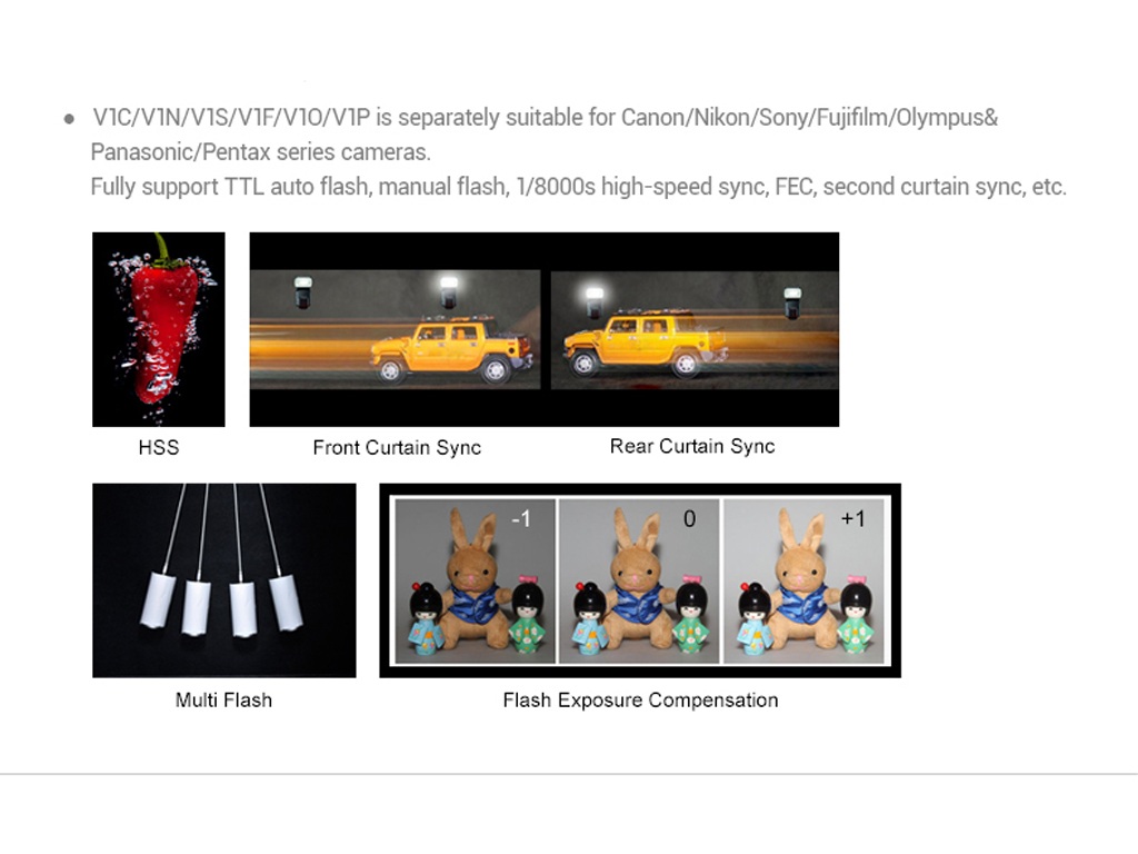 • V1, Canon, Nikon, Sony, Fujifilm, Olympus & Panasonic ve Pentax serisi kameralarla uyumlu TTL desteği, 1/8000 sn yüksek hızlı senkron (HSS), FEC, ikinci perde senkronu ve manuel flaş gibi gelişmiş özellikleri destekleyerek, uyumlu kamera/model ile eksiksiz bir flaş deneyimi sunar.